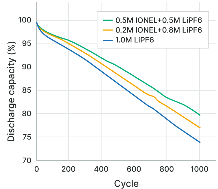 IONEL™纯度高,溶剂和副产物少,表现出稳定的电化学性能。迄今为止已被国内外众多客户采用和认证为锂离子电池电解质,其应用涵盖车载、民生和固定设备等多方面用途。