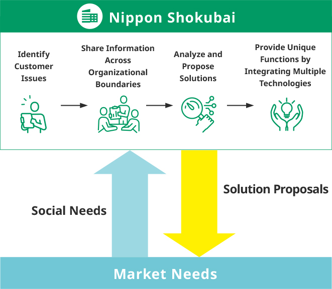 The name "Nippon Shokubai" reflects our commitment to developing our own catalysts and using them to create a wide range of chemical products, driving our growth and innovation.