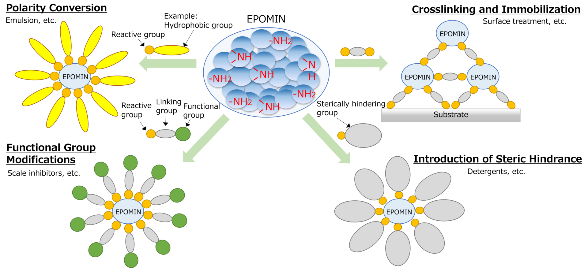 The amino group forms hydrogen bonds with hydroxyl group, ionic bonds with carboxyl group, and covalent bonds with the aldehyde group and ketone group. EPOMIN™ also has polar group (amino group) and hydrophobic group (ethylene group) in its structure, which and enhances its bonding force with materials of different polarities. These comprehensive bonding forces of EPOMIN™ are utilized in fields such as adhesion, ink, paint, and pressure-sensitive adhesive agents.