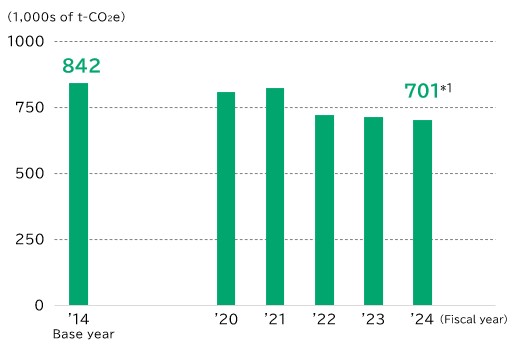 In FY2024, energy-saving activities progressed, and the energy consumption intensity improved due to an increase in the production volume of energy generation products. In addition, CO2 emissions decreased as a result of continued use of carbon offset city gas (formerly carbon-neutral city gas) and improvement in CO2 emission intensity. Our domestic GHG emissions in FY2024 were 701 thousand tons-CO2e*¹, representing a 16.8%*¹ reduction compared to FY2014.