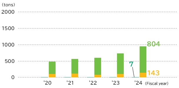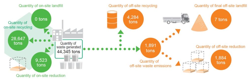 In FY2024, in addition to continuing to rigorously sort and collect and promote recycling, we reduced the quantity of waste sent to off-site landfills for disposal and maintained zero emissions by improving processes such that they produce less waste, reusing by-products, and treating product residues on-site.