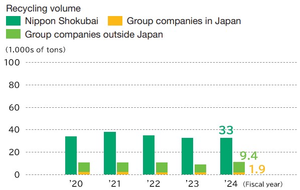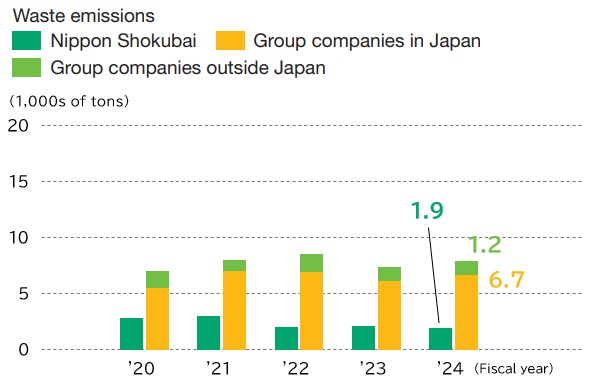 Nippon Shokubai Group has established the following statements in its Environmental Protection Policy: “Reduce emissions of waste and chemical substances, and promote the recycling and effective use of resources including water resources to contribute to the realization of a Sound Material-Cycle Society.” “Actively seek to develop and provide products and technologies that help reduce environmental impact.” Based on this policy, we are systematically promoting resource circulation and waste reduction.