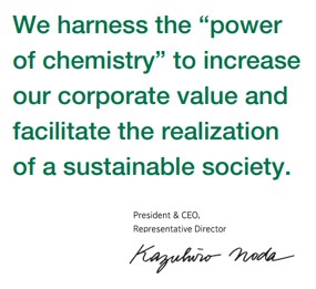 Protecting the global environment is our mission. We believe that technology, our strong suit, is what can make a difference in this day and age, when people truly desire to protect the global environment. The power of chemistry is essential to realizing a carbon-neutral, hydrogen-based society in the future. We intend to demonstrate our strengths so as to facilitate the realization of a sustainable society.