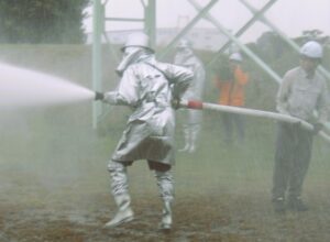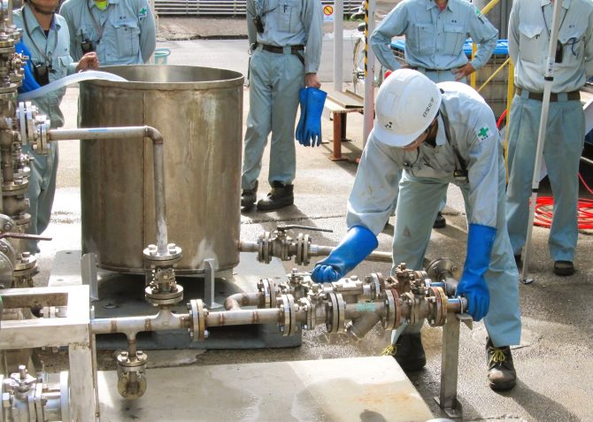 On the other hand, as a countermeasure against occupational injuries caused by chemical exposure—which have been increasing in recent years—we have resumed hands-on training to experience the dangers of liquid exposure using in-house equipment, which had been suspended during the COVID-19 pandemic. Through simulated experiences of chemical contact, we aim to raise employees’ safety awareness.
