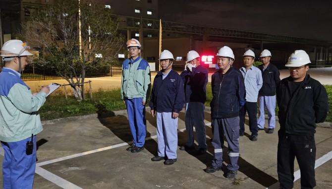The nighttime drill was conducted assuming a leakage caused by a rupture in the reboiler pipeline, with twelve participants including manufacturing personnel, sewage treatment personnel, power distribution room duty personnel, and packaging personnel. Among them, the manufacturing personnel wearing a chemical protective suit and putting on an air respirator, took charge of the emergency response.