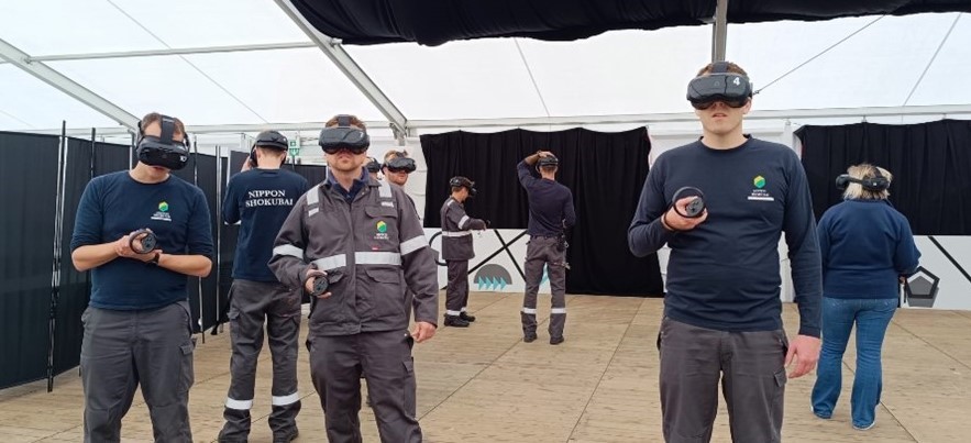 Using VR technology, a virtual production plant was created with various risks such as confined spaces, chemical and electrical hazards, working on scaffolding, dangerous traffic and hoisting, poor housekeeping, and many other potential dangers. Each participant received a VR headset and a control device to identify potential risks their avatar encountered during the safety tour in the virtual plant.