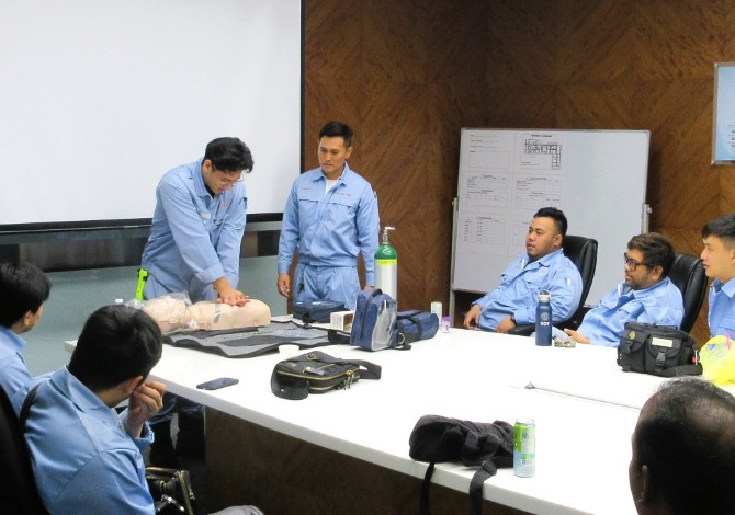 In our occupational safety and health initiatives, we emphasized basic safety behaviors such as ‘think before you act’ and the proper use of handrails on stairs. To ensure employee health, we presented strategies for heat stress prevention using Wet Bulb Globe Temperature (WBGT*1) monitoring and measures for hearing protection. Additionally, we highlighted the importance of training for critical life-saving techniques such as cardiopulmonary resuscitation (CPR*2), oxygen resuscitation, and the operation of an automated external defibrillator (AED*3) used during cardiac arrest.