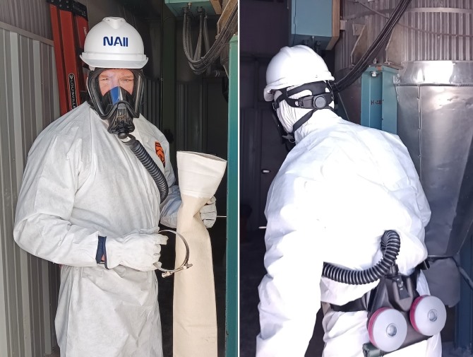 The Houston facility has started using powered air purifying respirators. Traditional respirators rely on the user’s breathing to draw air through filters, which can be strenuous and limit the duration of their use. PAPRs, on the other hand, utilize a battery-powered blower to pull ambient air through specialized high-efficiency particulate air filters to remove particulates and then push the clean air to the wearer’s facepiece. This process affords wearers of PAPRs a greater protection factor than simpler filtering respirators.