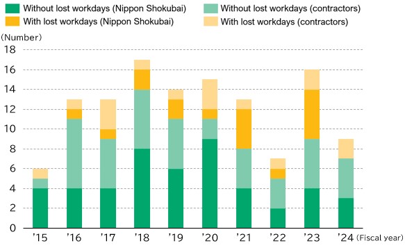 Zero injuries with lost workdays Zero injuries without lost workdays (including contractors) | Nippon Shokubai Injuries with lost workdays: 0 Injuries without lost workdays: 3 Contractors Injuries with lost workdays: 2 Injuries without lost workdays: 4 | Serious injuries*1: 0 Injuries with lost workdays: 0 Total occupational injury frequency rate*2 ≤ 1.5 (including contractors) |