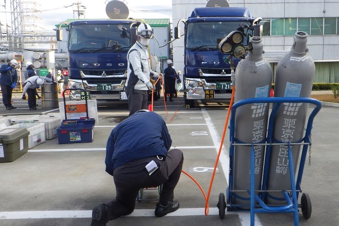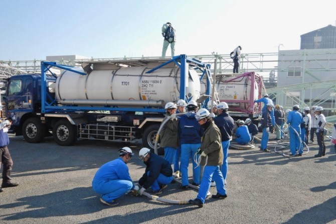 We regularly conduct drills for responding to accidents while products are in transit to make it possible to respond swiftly and minimize the damage in the rare occasions when such accidents occur.