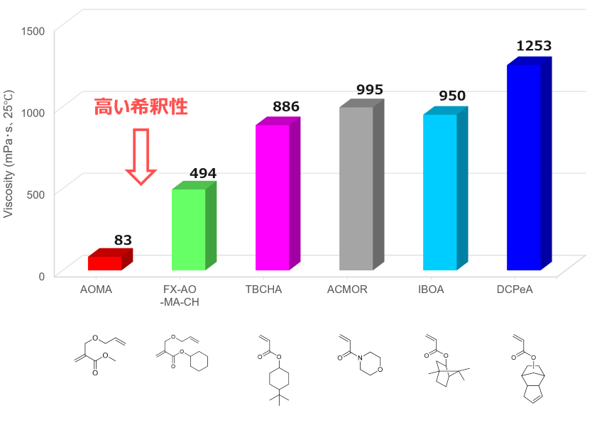 AOMAシリーズ(AOMA、FX-AO-MA-CH)は低粘度で多官能モノマーなどの希釈性に優れ、液組成物の低粘度化・高機能化に寄与します。