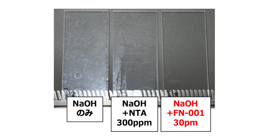 NaOHのみやNTA300ppm添加では、汚れの再付着が見られますが、FN-001 30ppm添加ではそれが見られず、高い洗浄力を示すことが分かります。