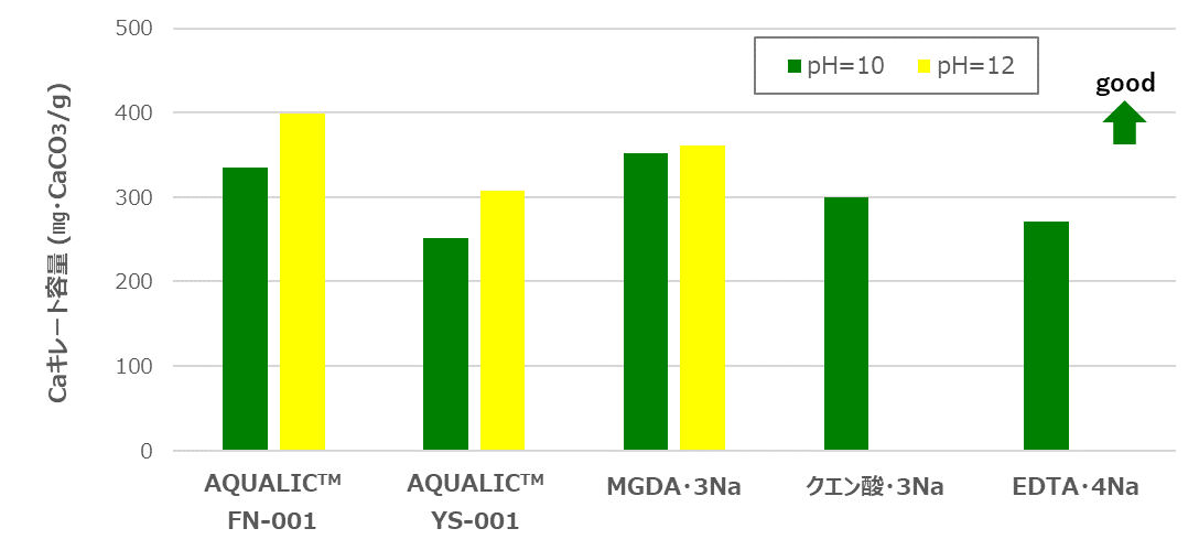 FN-001は、低分子のキレート剤(MGDA、クエン酸、EDTA)と同等の高いキレート能を有しています。