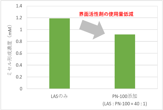 - PN-100の添加によって界面活性剤の臨界ミセル濃度を低下させることができます。界面活性剤は臨界ミセル濃度を境にして各種性能(洗浄、浸透など)が大きく変化するため、界面活性剤の使用量削減が期待できます。
