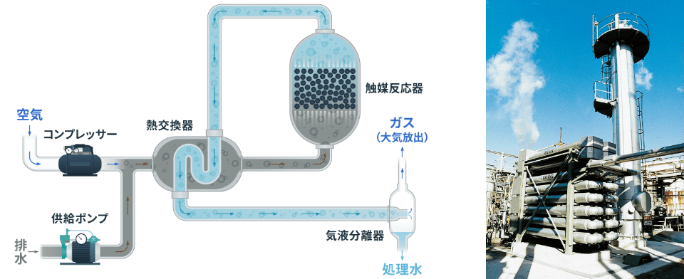 システムは、排水供給、圧縮空気供給(コンプレッサー)、熱交換、触媒反応、気液分離の各工程で構成されます。