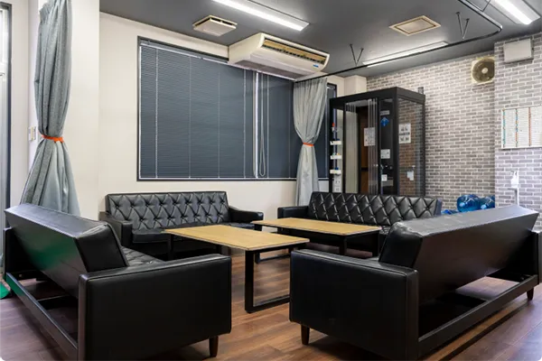 社員がくつろげる空間としてソファや喫煙ボックスが設置され、空調設備も整えられています。