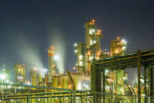 有数の工業地帯で夜間も稼働するため、さまざまな色合いの照明が幻想的な夜景をつくりだします。