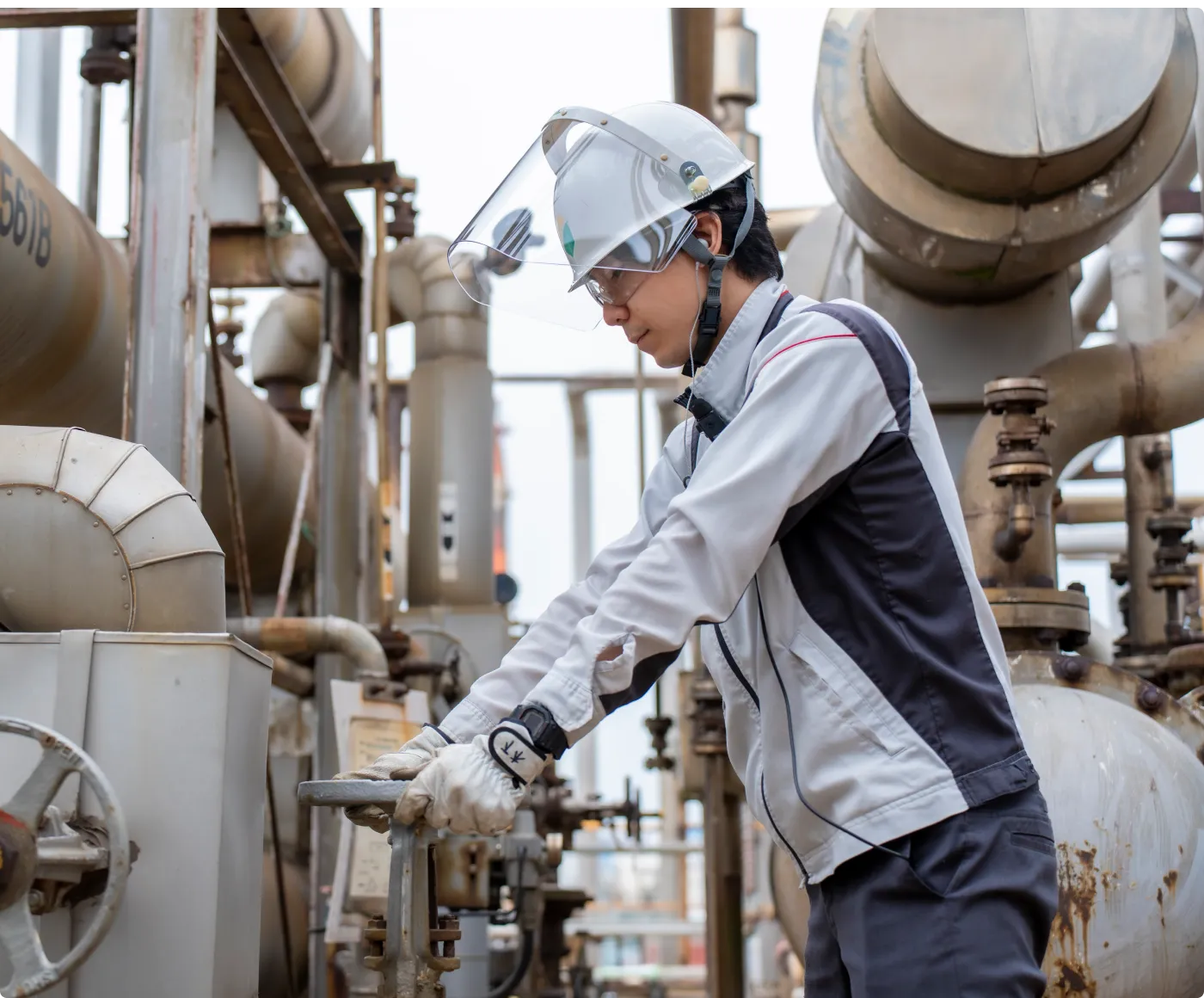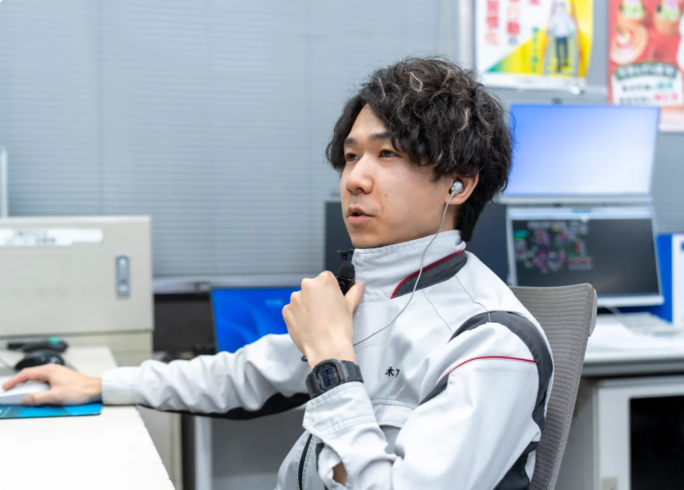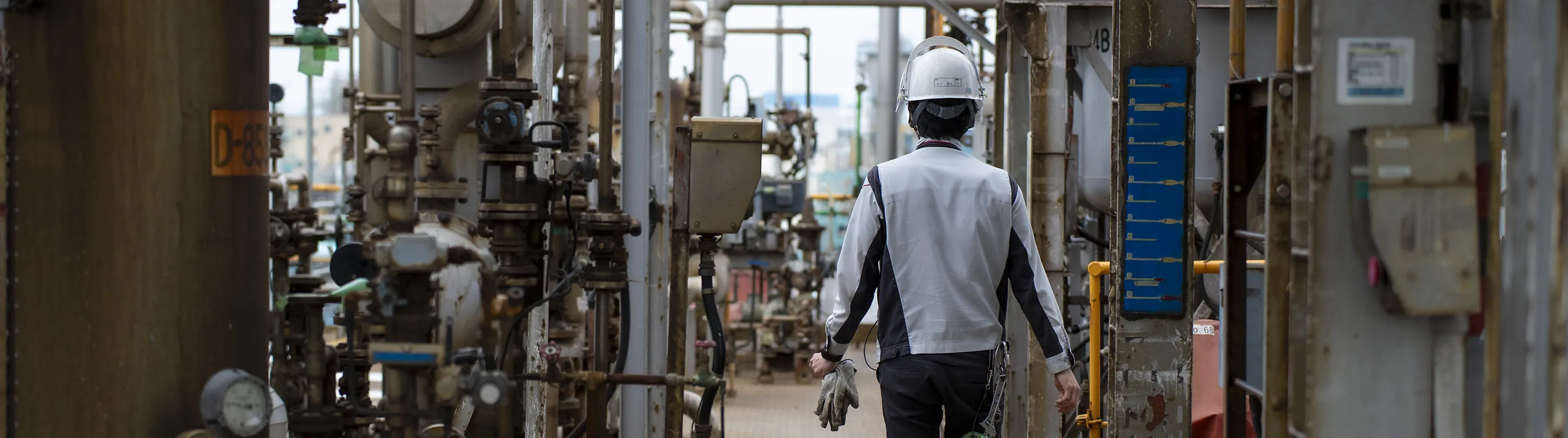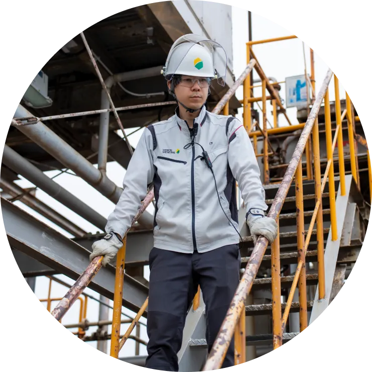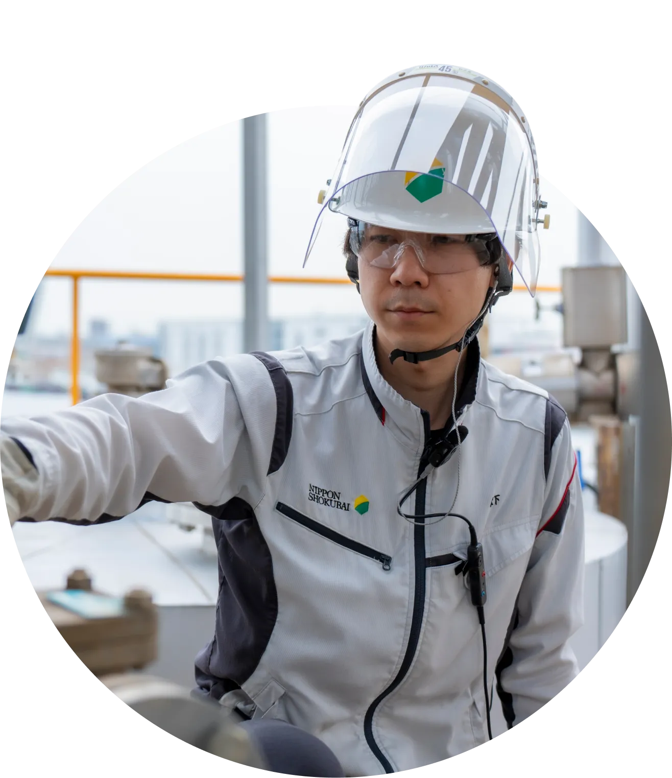 化学プラントの現場点検や、管制室で運転状況の監視を行うプラントオペレーターが私の仕事です。必要に応じて、現場設備の洗浄やトラブル対応などにも携わります。この仕事で最も大切になるのが、安定生産と危険防止に向けて安全性を確保すること。運転状況の監視で気になる点があればすぐに現場担当者に連絡し、素早く対応に当たるよう指示を出します。三交替勤務になるため生活リズムや体調面を維持するのはなかなか大変ですが、自分が業務に集中することで日本触媒の製品を多くの人々に安定して提供でき、それによって社会に貢献できていることに一番のやりがいを感じています。