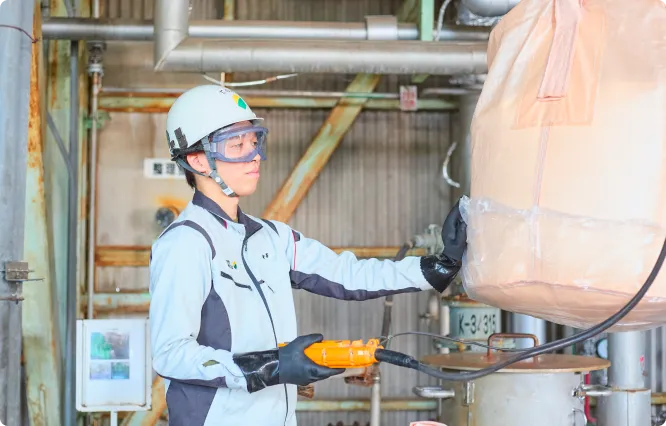 製品を製造するのに必要な原料を準備します。投入量や投入箇所・物質に間違いがないか確認しながら作業していきます。