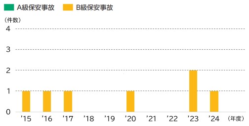 2024年度は、A級保安事故は0件でしたが、B級保安事故は1件発生しました。今後も、安全活動の継続的改善を図りながら、保安事故の未然防止に努めます。